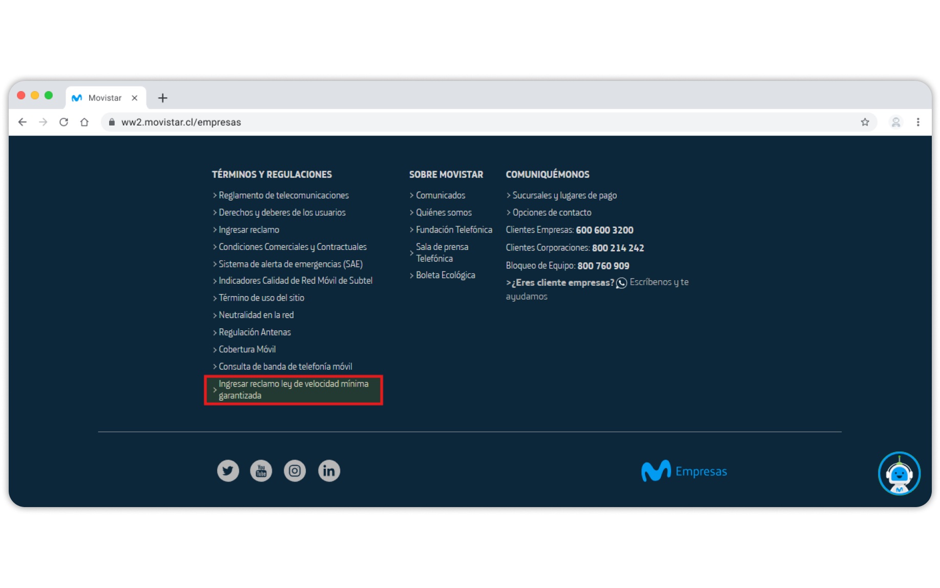 Si la velocidad de navegación no cumple con la normativa vigente, a continuación te indicamos cómo ingresar un reclamo a través de Movistar.cl/empresas.