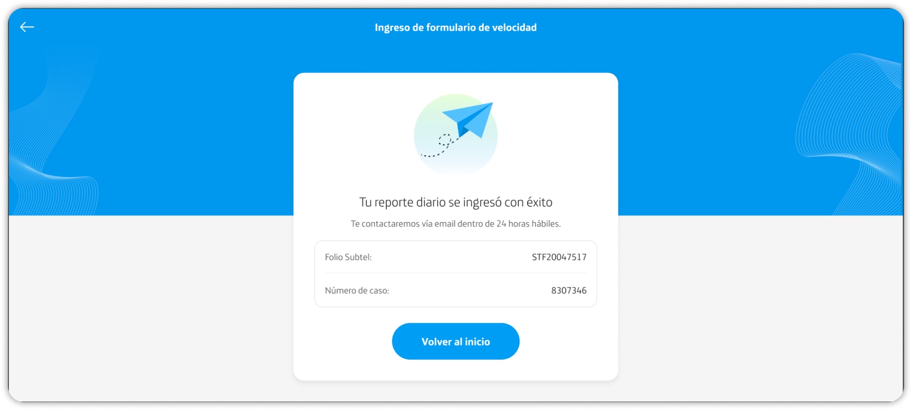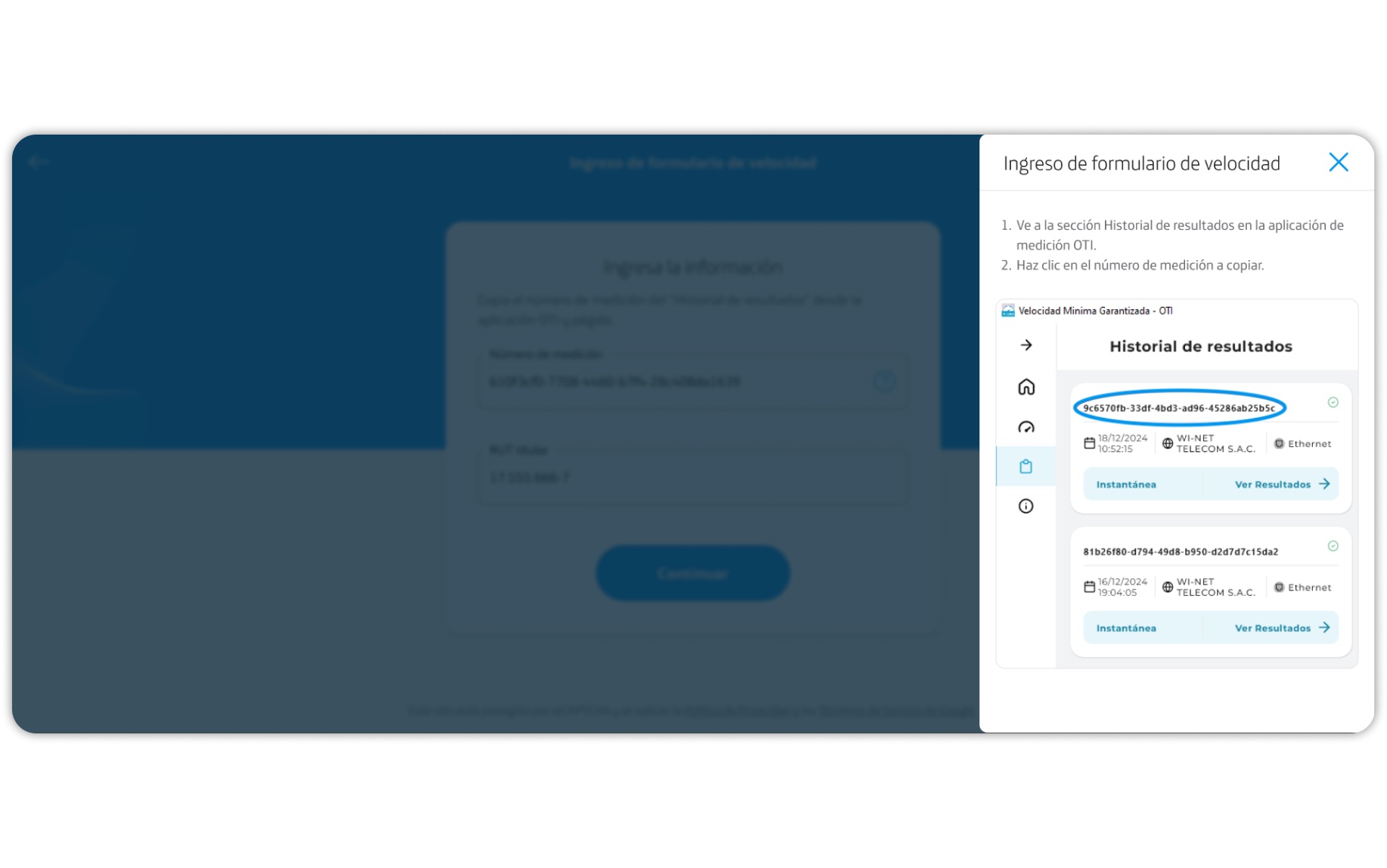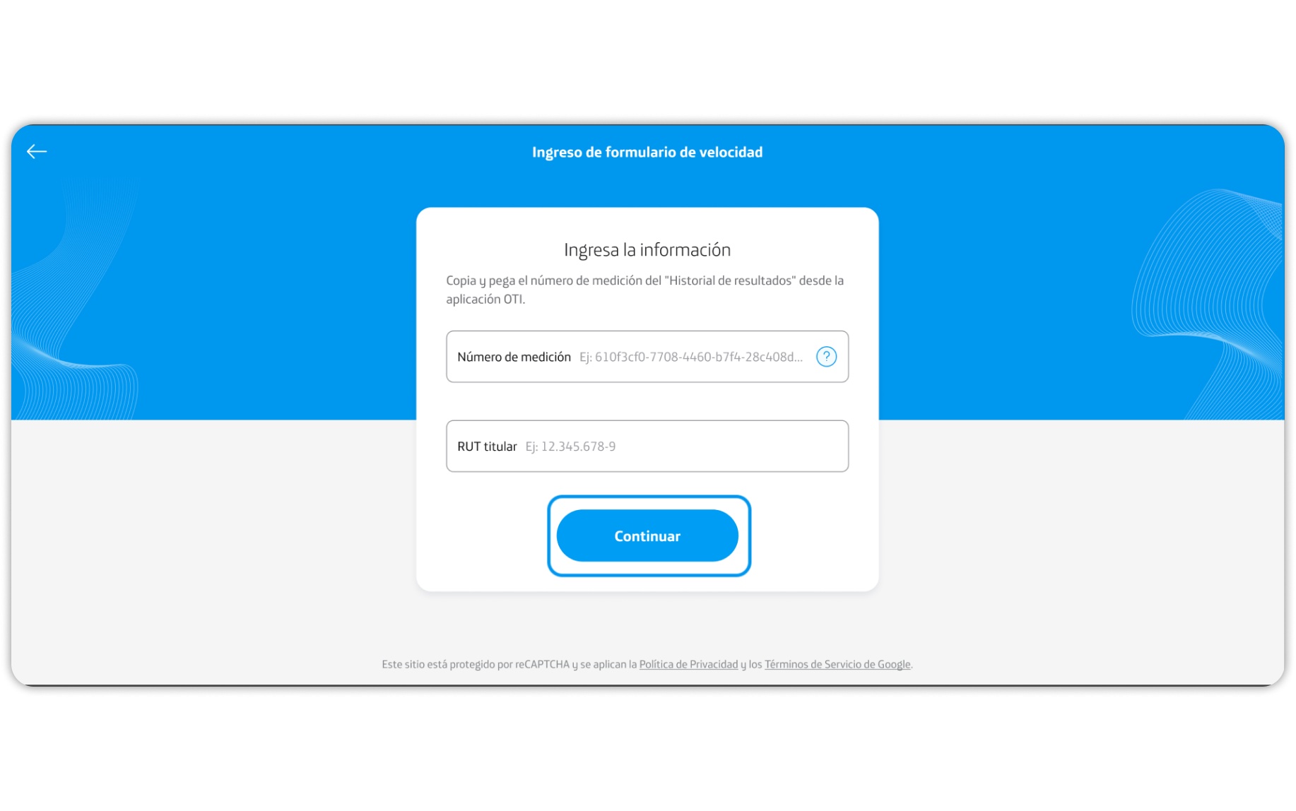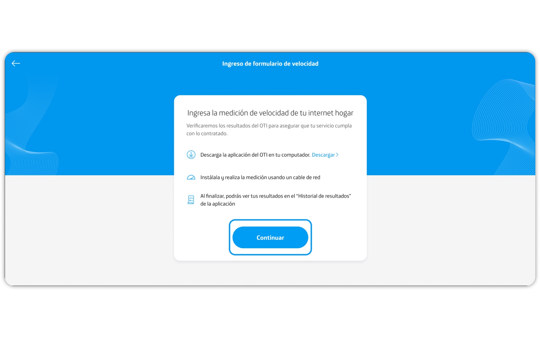 Debes medir la velocidad de tu internet hogar con la App OTI que también puedes descargar desde VMGChile. Presiona Continuar.