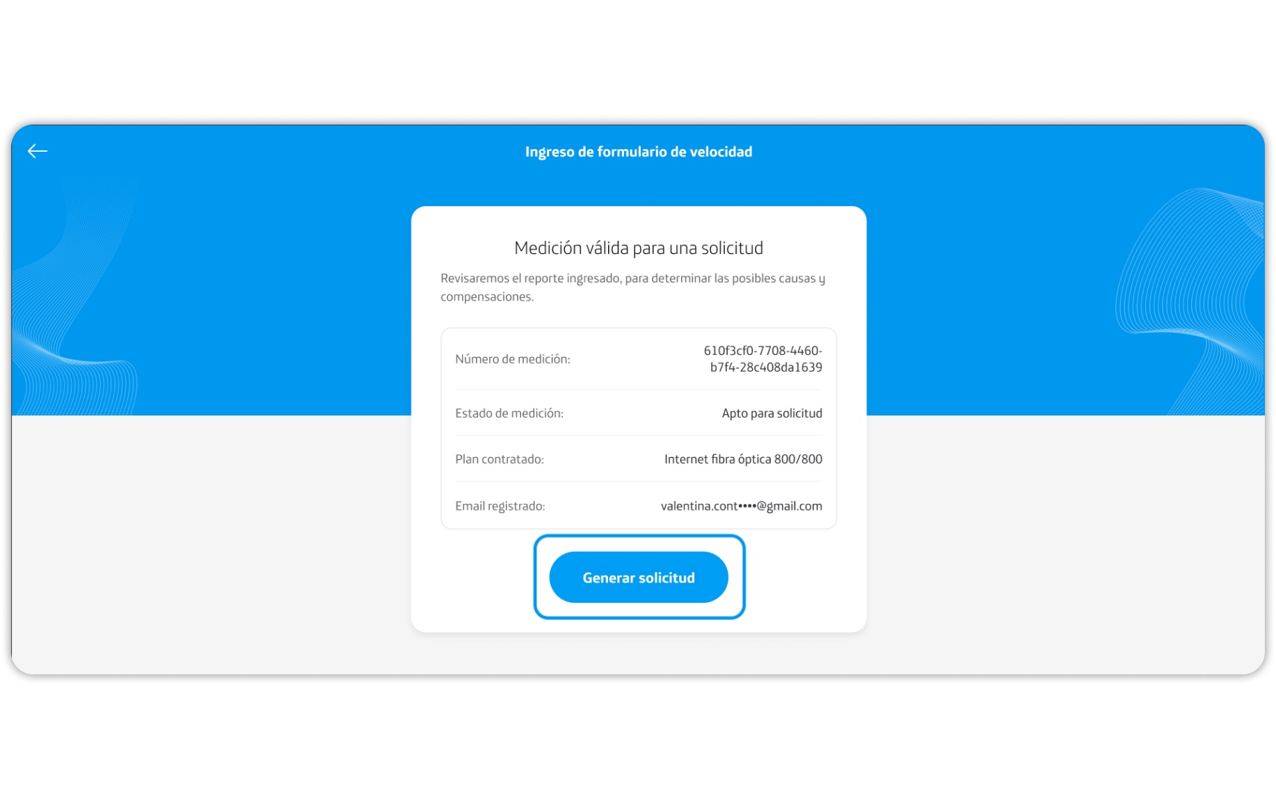 Con los datos ya ingresado y sólo si aplica la medición para generar un reclamo, podrás continuar con el proceso, luego debes presionar sobre Generar solicitud.