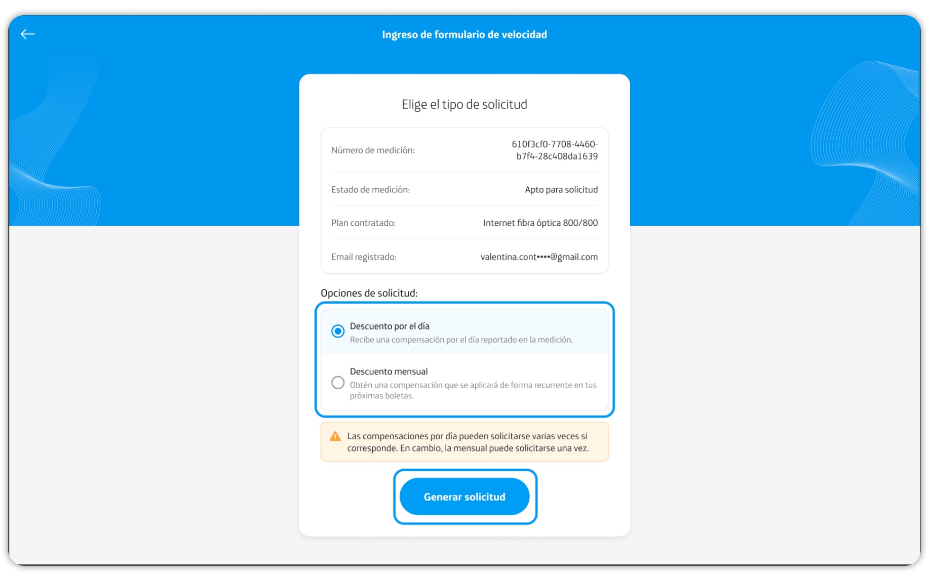 Si cuentas con más de 5 reclamos podrás acceder a la compensación mensual, de lo contrario sólo podrás acceder a la compensación diaria. Selecciona la opción que corresponda y presiona sobre Generar solicitud.